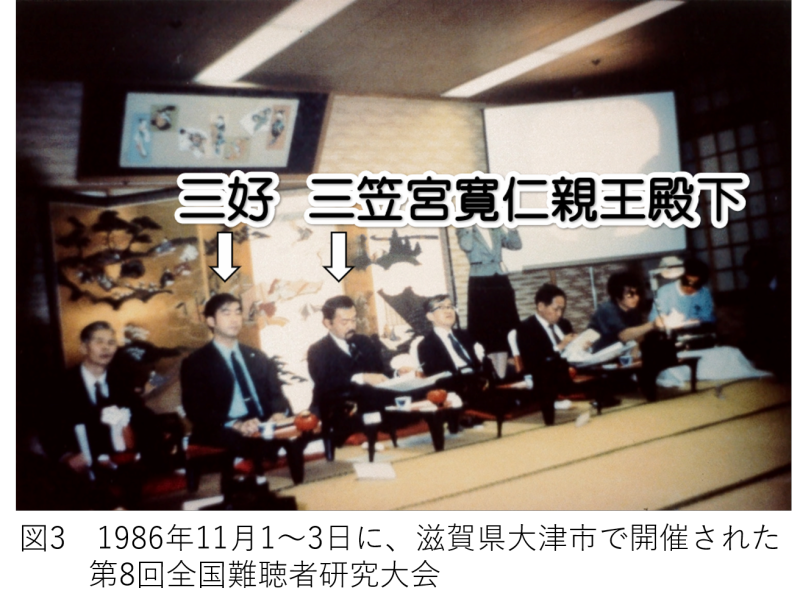 実際、1986年には全国難聴者研究大会に三笠宮寛仁親王(図3)を私のルートでお招きしたり、また、1988年のスイス・モントルーにおける国際難聴者国際会議で難聴者の付き添い(図4)をしたり、私なりに出来ることをして来たつもりです。