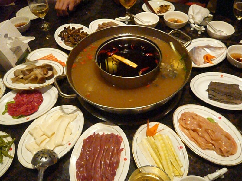 うこっけいの出汁(だし)のスープに、唐辛子ソースをむちゃくちゃたくさん放り込んで、真っ赤になった鍋で肉や魚そして野菜を、ゆでて頂く料理です。
