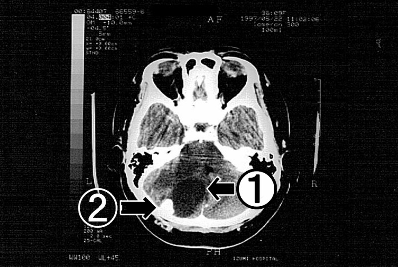図2 脳神経外科受診当日の単純CT。左側小脳半球に嚢胞①を伴う腫瘍②を認め、第Ⅳ脳室の右方偏移が見られた。