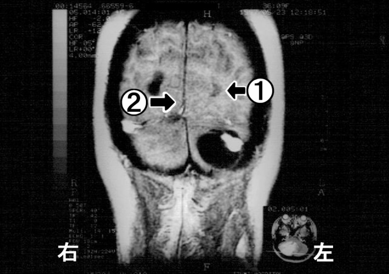 図4 MRIにて圧排された左側側脳室①と、右方への大脳鎌ヘルニア②が観察される。(T1造影MRI)