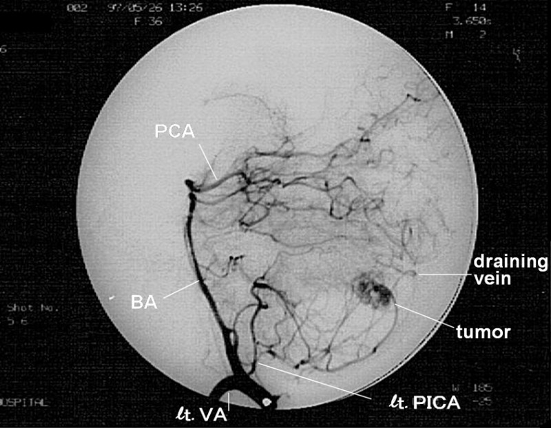 図5 DSAでは、左側PICAをfeeding arteryとする腫瘍像が描出され、draining veinも見出された。
