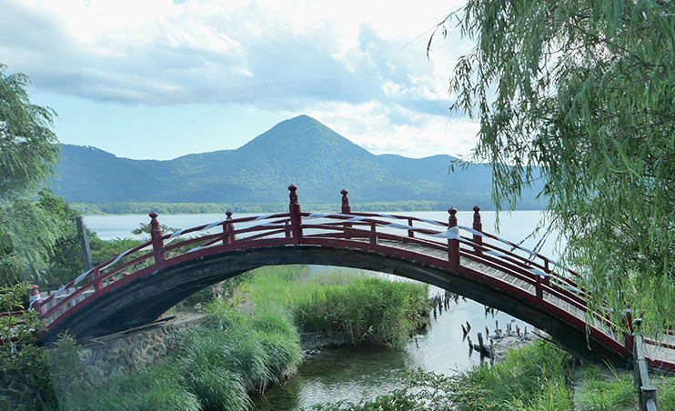 美しくも恐ろしい宇曽利湖の景色を眺めていると、一際赤い橋が見えました。