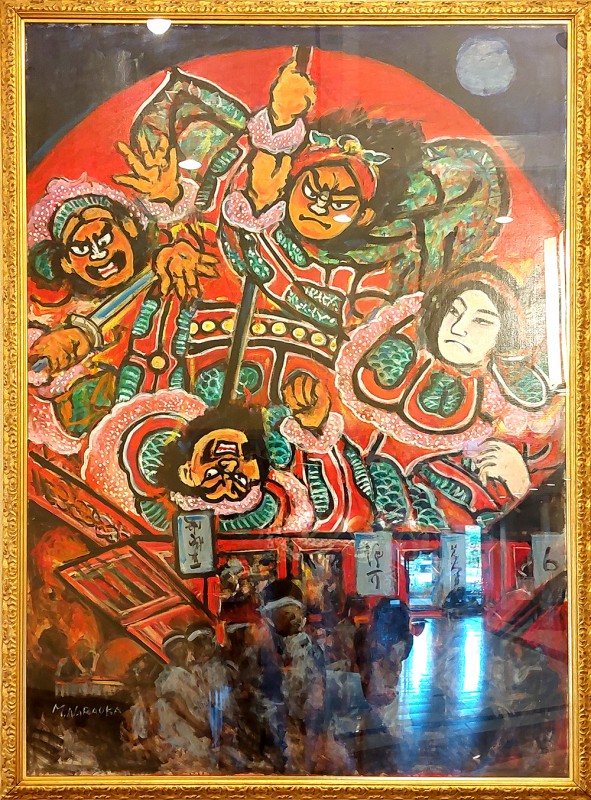 ツアー3日目、本日も晴天に恵まれるなか、むつグランドホテル館内に飾られたねぶた祭りの絵(図1)に見送られたツアー一行は、下北半島の西端を目指してバスに乗り込みます。