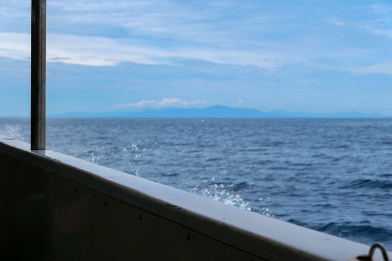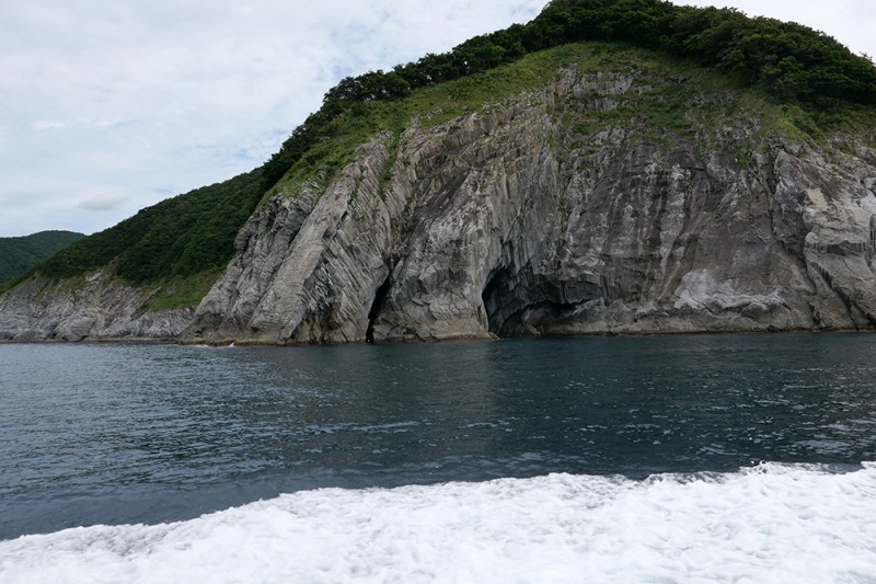 まず私たちは、仏ヶ浦の北側にある佐井港を訪れ、そこから船に乗って現地に向かいます(図7)。海は比較的穏やかで、船は水しぶきを上げながら順調に進んでいきます(図8)。