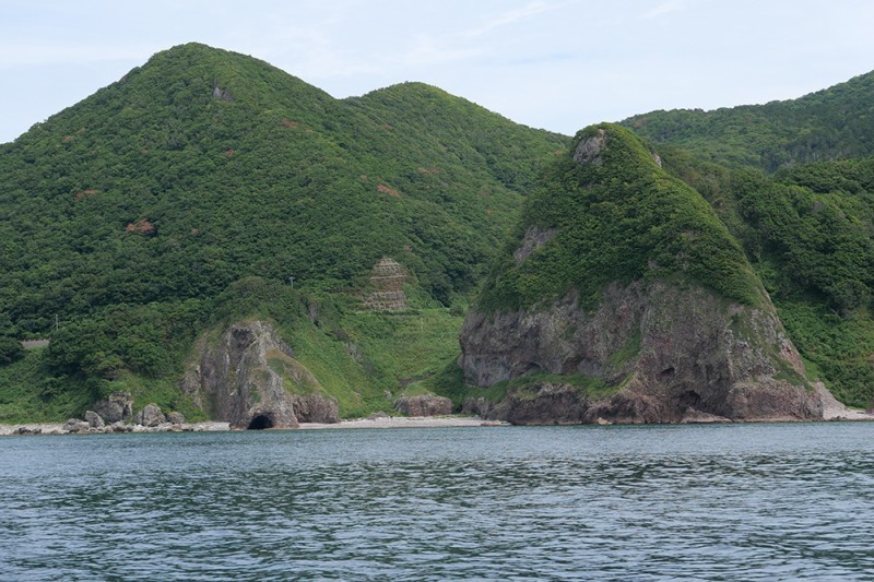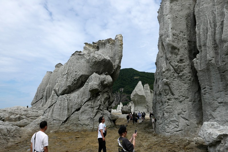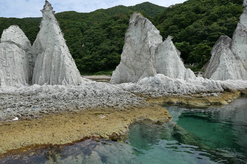 下北半島の西の海岸沿いには、火山灰によって形成された緑色凝灰岩による断崖が、およそ二キロに渡って奇勝が広がっています(図6)。エメラルドグリーンの海と、そこからのぞく白緑色(びゃくろく)の奇岩・巨石の数々が並ぶ風景は、まるで別世界にいるような気分にさせられます。