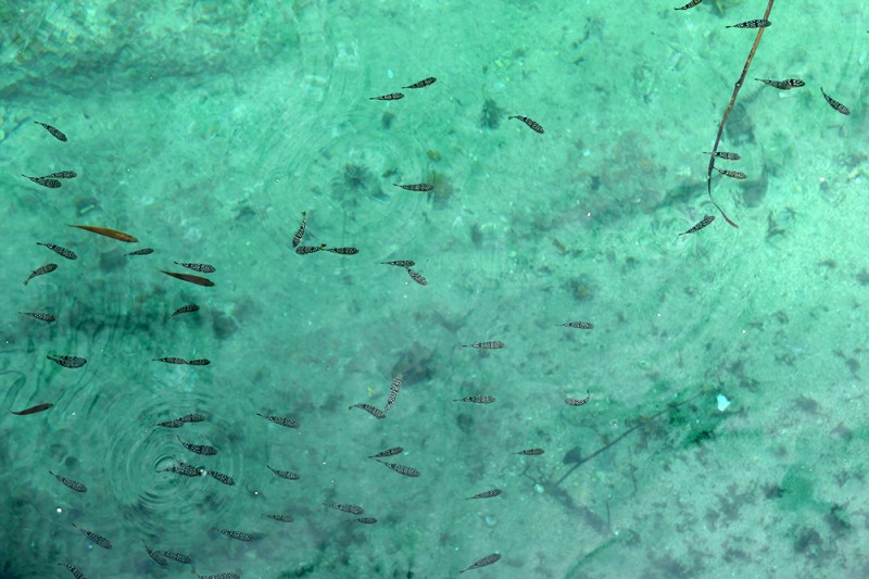 上陸すると、岸壁から海を覗くとエメラルドグリーンの海中を泳ぐ小魚の群れが見えます(図15)。