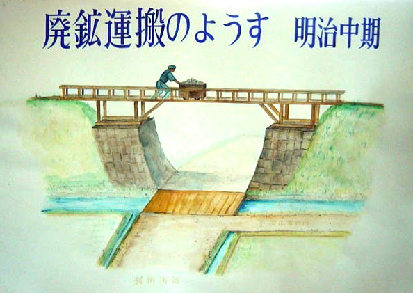 公園に到着し、まず目に入ってきたのは年季を感じさせる石垣ですが、この石垣は橋脚跡(図3)なのだそうです。橋脚跡とは、過去に橋の本体を支えていた橋脚が取り壊されたり、地盤沈下などで地表に露出したりした遺跡や痕跡のことを言いますが、かつてはこの石垣の上をズリ(鉱山や炭鉱で採掘される、価値のない岩石や土砂を指します)を乗せた車が往来していました(図4)。