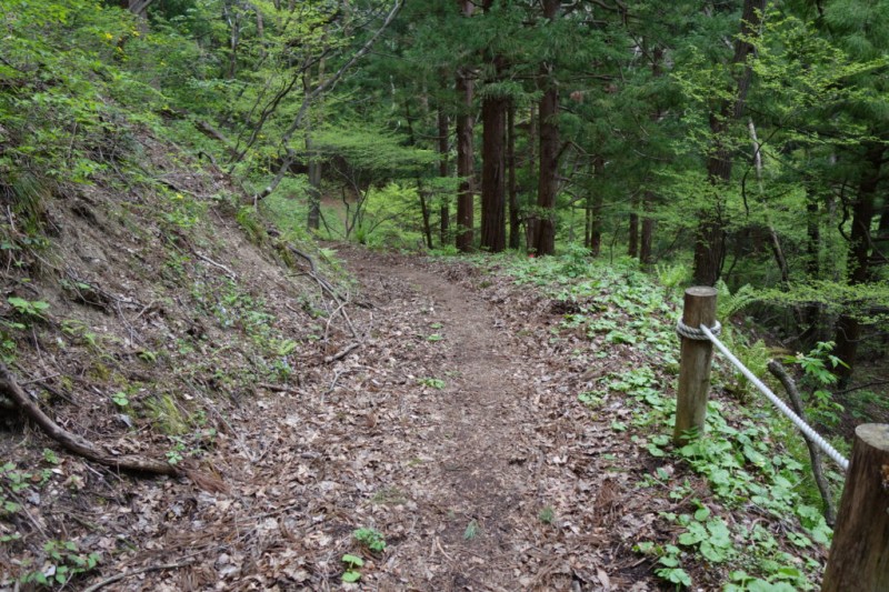 自然公園駐車場から一体どれ程歩いたでしょうか。ハイキングコースを外れてからは道が極端に狭くなり(図9)、中鋪跡到着に王手をかけます。その道がまた恐い位にぬかるみ、そして急勾配……ガイドさんからも、中鋪跡はこの下になりますので、恐いと思われる方は滑りますし無理をしないようにとの注意喚起がありました。