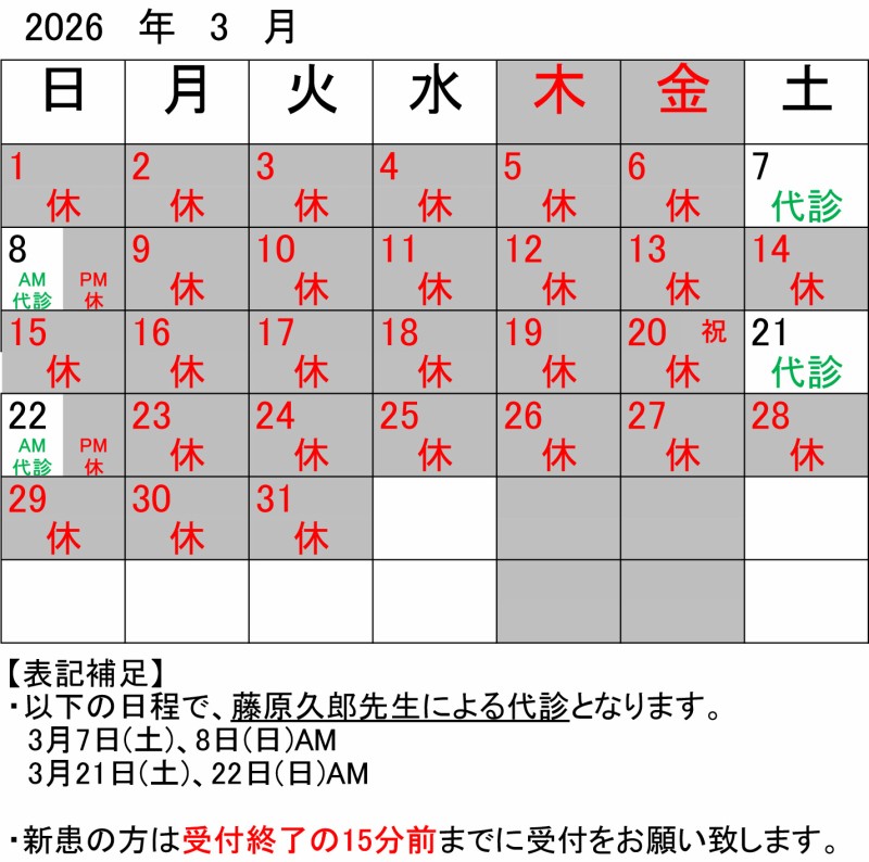 【重要】代診による診療再開について 院長<急性肺炎>の治療のためしばらく休診とさせて頂いておりましたが、3月から代診による一部診療を再開させていただきます。 代診医師は、当院ホームページでもご紹介させて頂いている 藤原久郎 先生 です。 (https://www.3443.or.jp/news/?c=18985) 診療日は、以下の通り3月中の第2・第4の土曜・日曜の予定です。 平日につきましても代診医師による診療を調整しておりますので、随時ホームページ上でご案内させて頂きます。