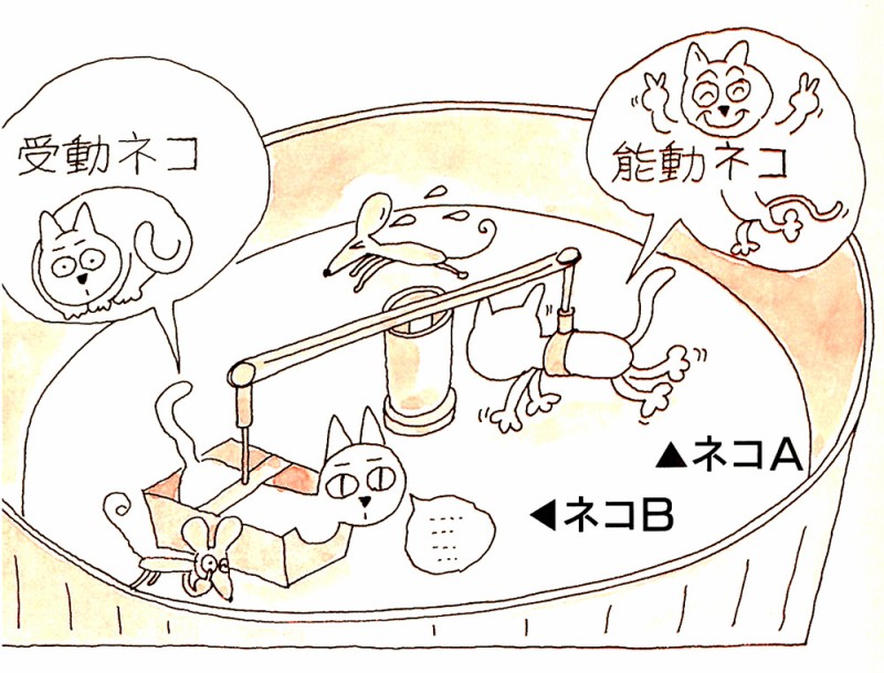 これに対してネコBは、エサや興味の対象のほうへ行きたいと思っても、それができません。そればかりか、ネコAの動きによっては、まるで反対のほうへ移動させられることさえあります。