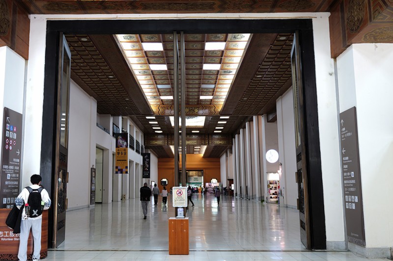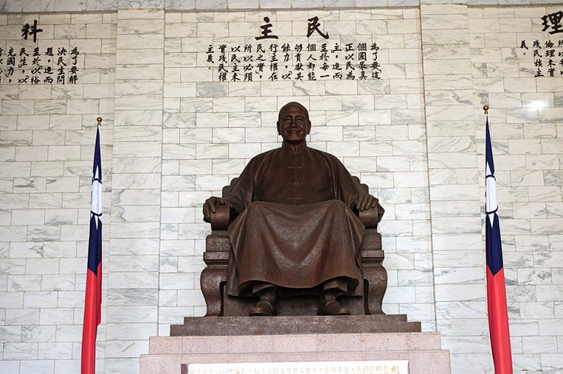 アーチ状の入口から入ると天井の高いメインホールがあり、その奥には高さ6.3メートルの蒋介石を模した銅像が鎮座しています。背後の壁には蒋介石の政治理念であった「倫理、民主、科学」の文字が刻まれています(図26)。